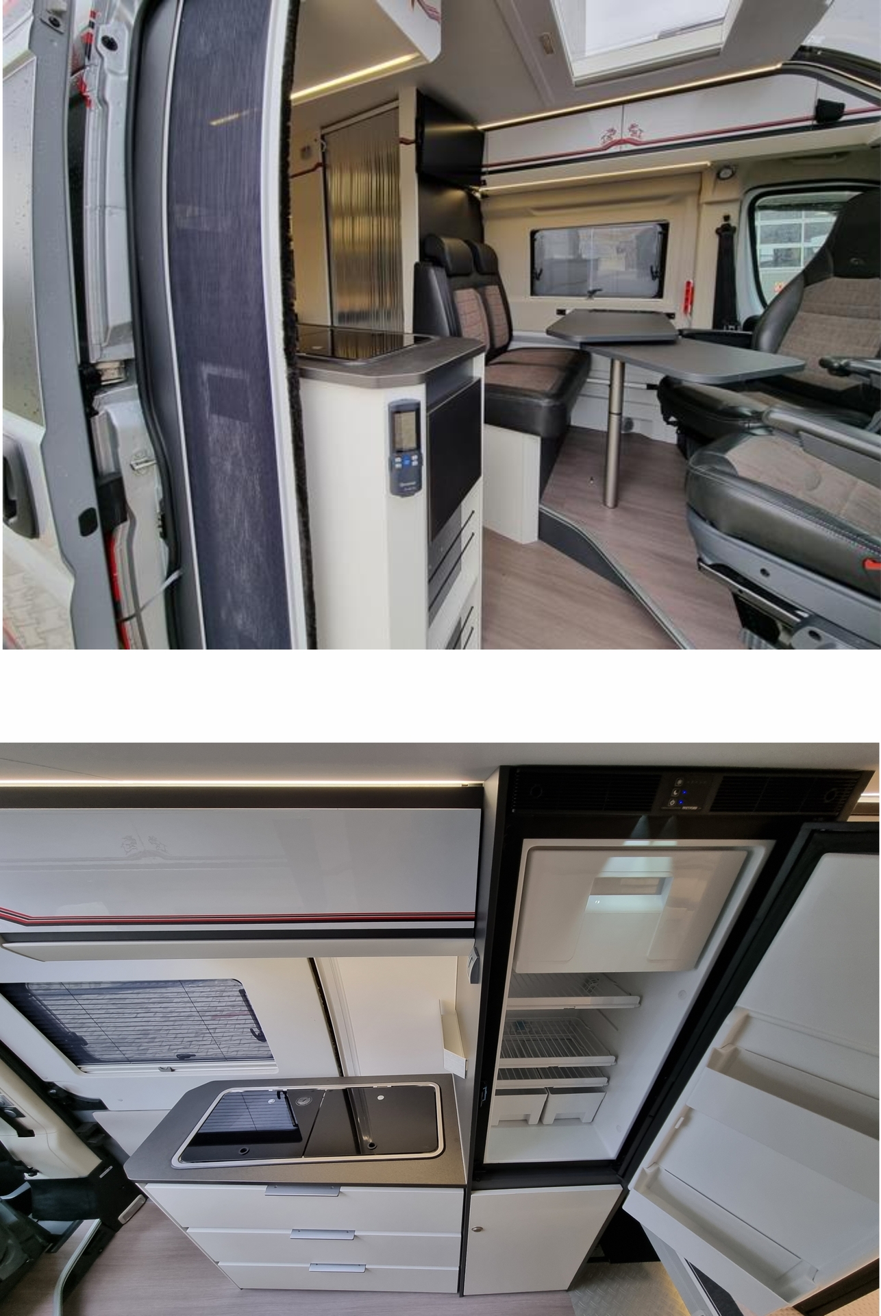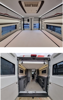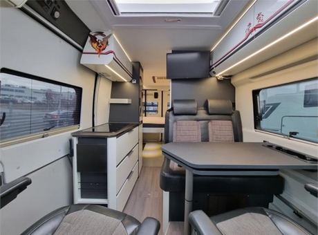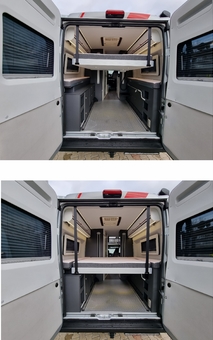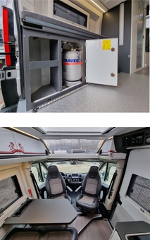 V zadní části pod lůžkem držák pro instalaci mikrovlnky (udělaný tak aby se vešla do zasní části i motokára 60cm. Na podlaze rychlo úchyty pro zabezpečení nákladu. Místo 2 láhve (nepotřebné) upravený nábytek pro více místa na odkládání. Upravená skříň – výsuvná polička a výsuvné šuple pro zjednodušení manipulace v kuchyňce + přidaná 220V zásuvka – skříň dodatečně osvícená Led.