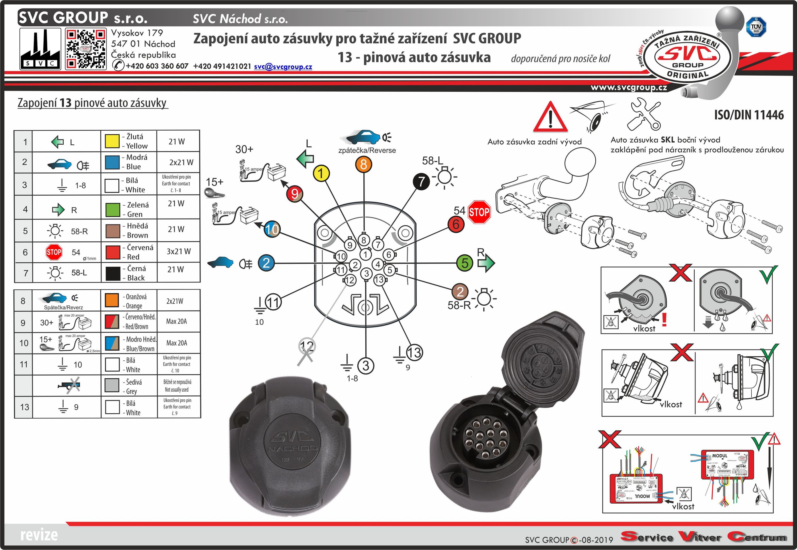 13*/13 - Auto zásuvka je kompletně 13 vodiči a vyhovuje pro použití od nosičů kol až po obytné přívěsy (karavany). Pokud nevyužíváte funkce pro karavan +15/+30 nemusíte tyto vodiče v propojovat z vozem. Pro běžnou a základní funkci na základě rozhodnutí EU stačí propojit základní pozice v auto zásuvce 1 až 8. Propojení vodičů +15/+30 pro karavany, většinou vyžaduje vést složitě vodiče až do motorového prostoru.