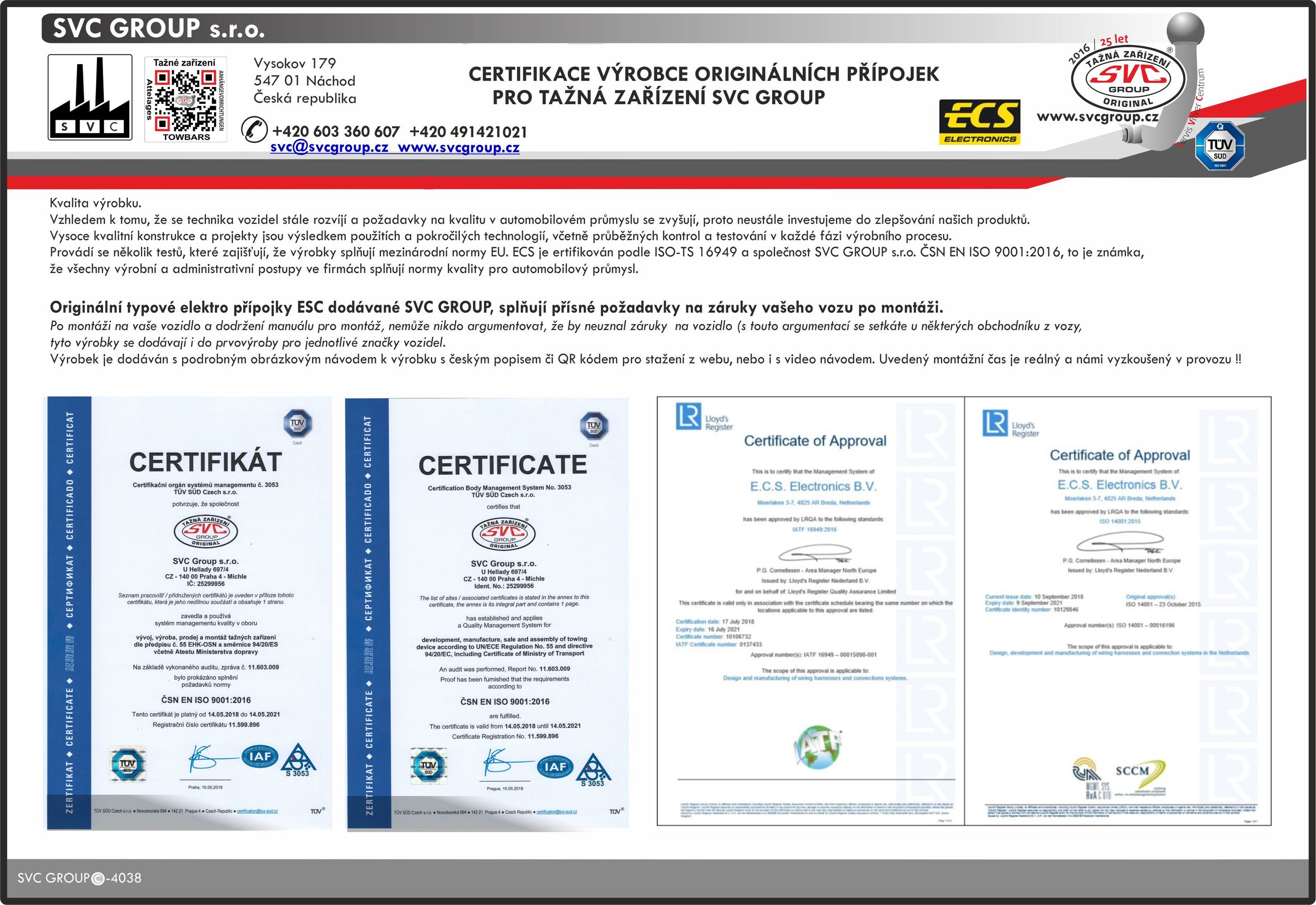 SVC GROUP a ECS Elektronik Garantuje kvalitu výroby a dodávaného zboží řadou norem ISO ČSN EN 9001:2016 a IATF 16949 a ISO 14001, to znamená, že všechny procesy ve spolupracujících firmách splňují standarty kvality pro automobilový průmysl a zaručení všech záruk na vozidlo po montáži.