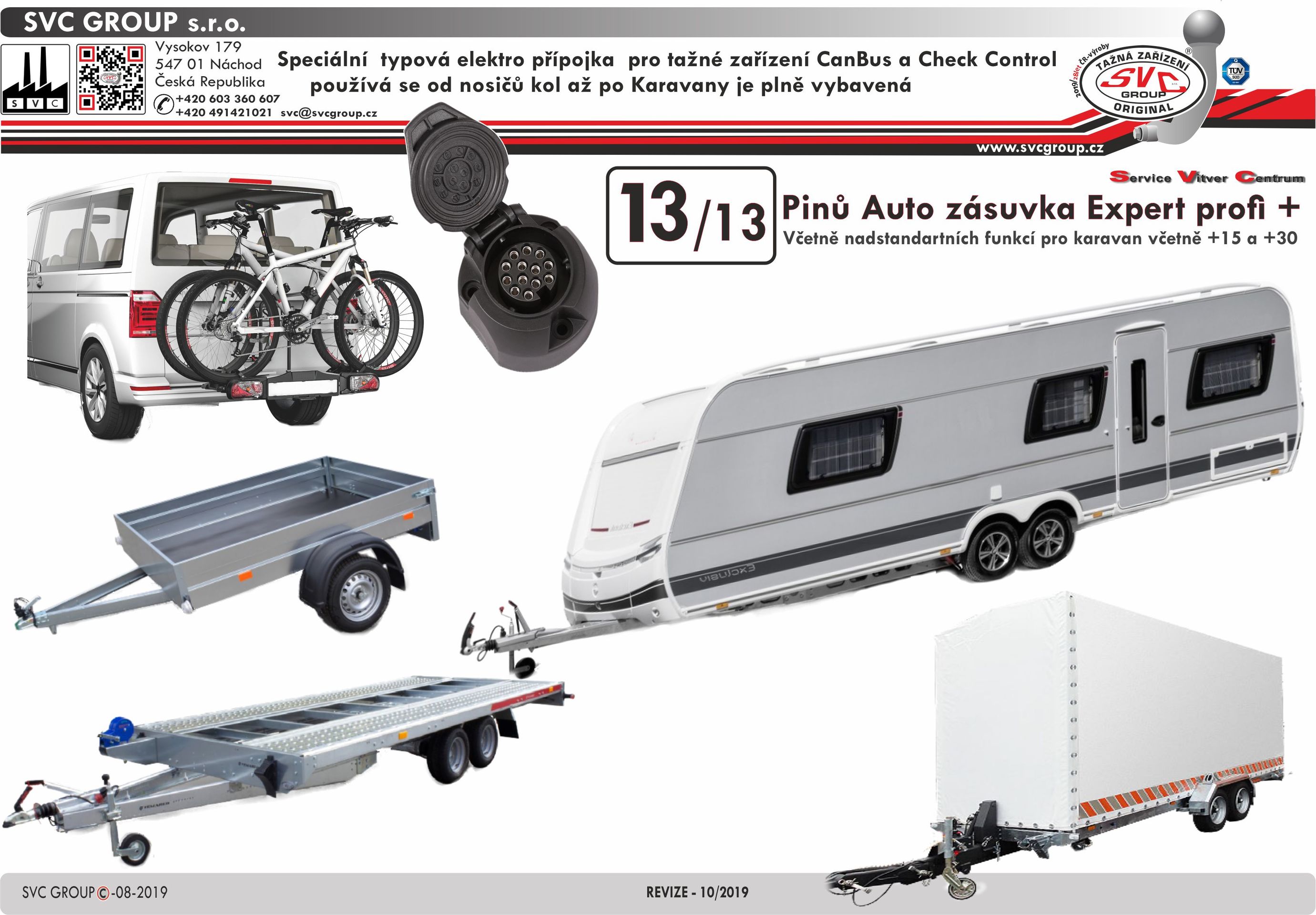13*/13 - Auto zásuvka je kompletně 13 vodiči a vyhovuje pro použití od nosičů kol až po obytné přívěsy (karavany). Pokud nevyužíváte funkce pro karavan +15/+30 nemusíte tyto vodiče v propojovat z vozem. Pro běžnou a základní funkci na základě rozhodnutí EU stačí propojit základní pozice v auto zásuvce 1 až 8. Propojení vodičů +15/+30 pro karavany, většinou vyžaduje vést složitě vodiče až do motorového prostoru.