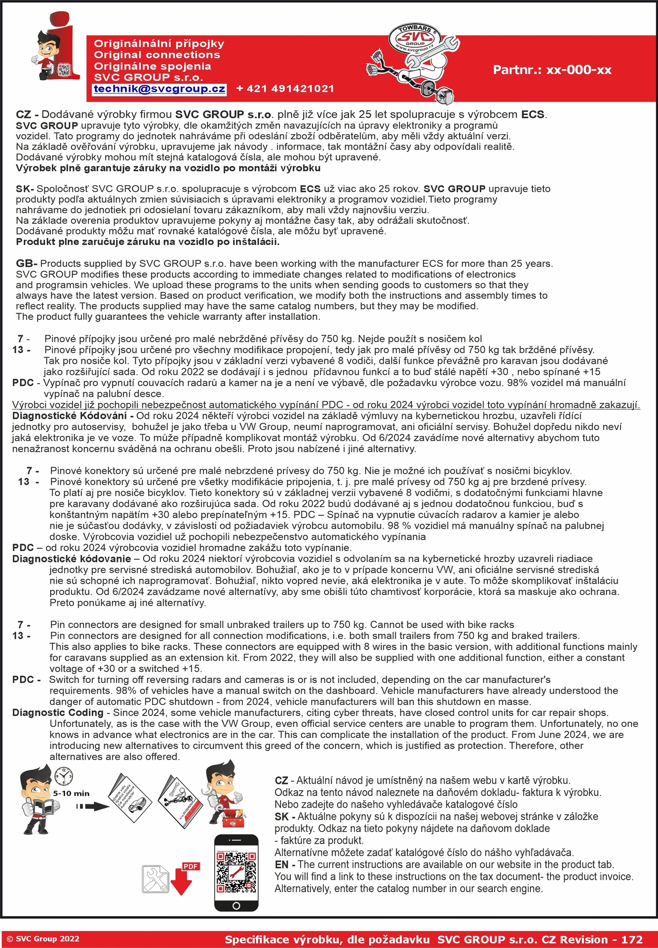 5- Elektro přípojka je vhodná pro všechny typy a výbavy vozidel, ke kterému je doporučená na našem webu SVC GROUP. Při objednání zboží nemusíte nic rozlišovat, lze jí použít na běžné vozidla bez přípravy, tak i pro příplatkovou přípravu elektroinstalace vozu pro tažné zařízení.