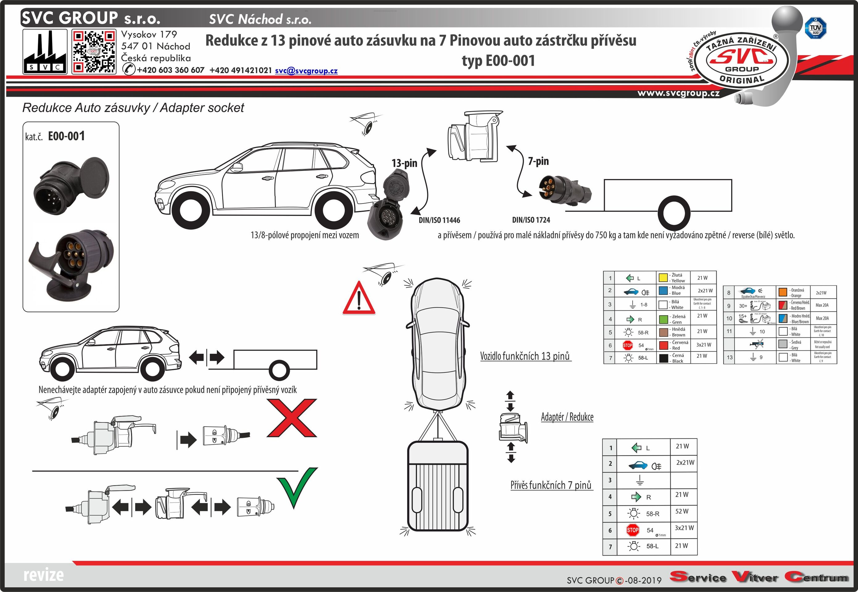 13/8 - Auto zásuvka je osazená 8 vodiči a vyhovuje pro použití od nosičů kol a různých adaptéru až po velké přepravníky, přívěsy až po karavany. Pokud požadujete pro karavan a přívěsy doplňkové funkce pro spínané +15 nebo stálé napětí +30 přiobjednejte si prosím doplňkovou sadu SP-133-ZZ. Tato přípojka má přípravu pro rozšiřující sadu +15/+30 z výroby a lze jí o tyto dodatečné funkce převážně pro karavan kdykoliv rozšířit. Pokud máte přívěsný vozík s 7 pinovou auto zásuvkou můžete použít přechodový adaptér E00-001