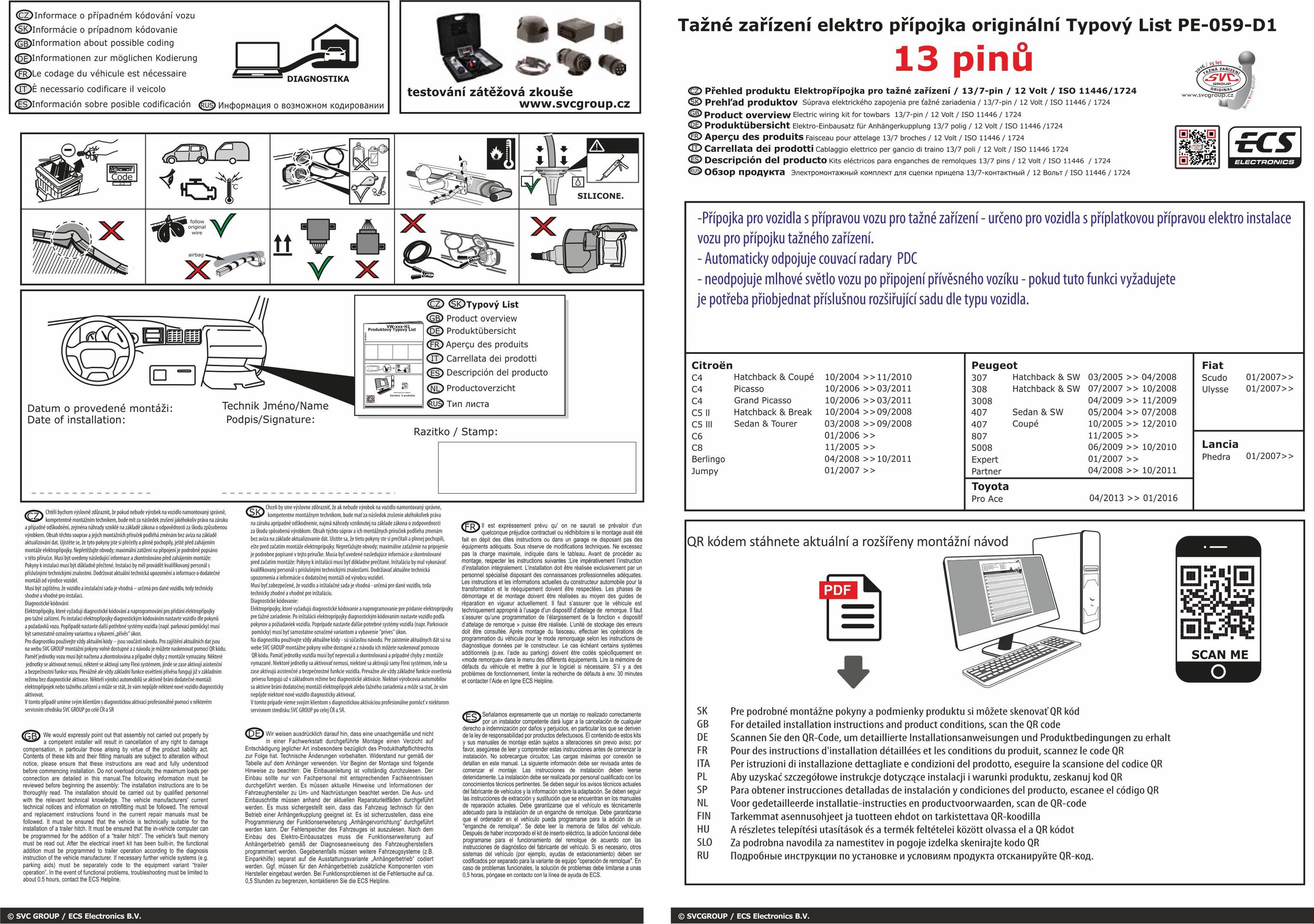 Originální typová elektropřípojka / Přípojka pro připravenou elektroinstalací pro tažné na voze / Výrobek neomezuje záruku po montáži na vaše vozidlo. /Vhodné také pro typy vozidel revize 4/2021: CITROËN BERLINGO BUS 04/2008-10/2011 B9 CITROËN BERLINGO 04/2008-10/2011 B9, CITROËN C4 3 Dveře HB 10/2004-11/2010 LC, CITROËN C4 5 dveří HB, 10/2004-11/2010 LC, CITROËN C4 COUPÉ 12/2004-11/2010 LA, CITROËN C4 GRAND PICASSO 10/2006-03/2011 UA, CITROËN C4 PICASSO 10/2006-04/2011 UD, CITROËN C5 II 5 dveří HB 10/2004-09/2008 RC, CITROËN C5 II Combi 10/2004-09/2008 RE, CITROËN C6 sedan 01/2006- TD, CITROËN C8 11/2005- EA, EB, CITROËN JUMPY 01/2007-06/2016, FIAT SCUDO 01/2007- 270, 272, FIAT ULYSSE 01/2007- 179, LANCIA PHEDRA 01/2007- 179, PEUGEOT 307 3 dveře HB 03/2005-04/2008 3A/C, PEUGEOT 307 5 dveří 03/2005-04/2008 3A/C PEUGEOT 307 SW Combi 04/2005-04/2008 3H, PEUGEOT 308 3 dveře 07/2007-09/2008 4A, 4C PEUGEOT 308 5 dveří HB 07/2007-09/2008 4A, 4C PEUGEOT 308 SW Combi 07/2007-09/2008, PEUGEOT 407 COUPÉ 10/2005-12/2010 6C, PEUGEOT 407 Sedan 05/2004-07/2008 6D , PEUGEOT 407 SW Combi 05/2004-08/2008 6E, PEUGEOT 5008 MINI 06/2009-10/2010, PEUGEOT 807 11/2005- E, PEUGEOT EXPERT 01/2007-06/2016 VF3A, VF3U, VF3X, PEUGEOT PARTNER 04/2008-10/2011, TOYOTA PROACE 04/2013-01/2016 MDX,