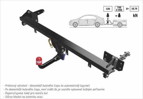 Prémiový výrobek, který používáme na našich výrobcích je určený pro klienty, kteří preferují maximální kvalitu a estetiku vozu po demontáži kulového čepu z tažného zařízení. Po demontáži a zaklopení elektroinstalace SKL, není na vozidle vidět, že by bylo vybavené  tažným zařízením. Kulový čep, je v černém provedení velice kvalitní povrchovou úpravou KTL.    Dle platných předpisů EU, musí být kulový čep demontován z vozu, pokud není využíván v provozu