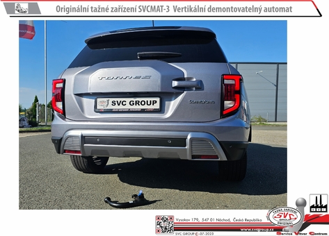 Prémiové tažné zařízení na vertikální automat KGM/Ssang Yong Torres -  Benzín a EVX - plně elektrická verze + rezervní kolo a verze 4x4 kola  elektro vozidlo.  Tažné lze použít na všech vozech a všech druzích výbavy. Nemusíte nic rozlišovat. Tedy lze použít na vozech jak s rezervou tak bez ní, pro nožní otevírání dveří...  a všechny motorizace včetně elektro auta. Tam kde není povolené tažné ... tedy u některých elektro aut. tažné zařízení, lze použít jako držák nosičů kol. Pro nosiče kol je tento typ tažného zařízení doporučený  Tento výrobek po demontáži kulového čepu a zaklopení auto zásuvky není na voze vidět že má tažné zařízení.  Výrobek schválený a doporučený dovozcem vozidel , garantuje záruku na vaše vozidlo.