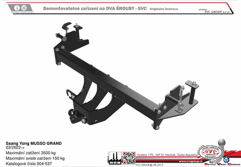 Tažné zařízení s výškově nastavitelným kulovým čepem na dva šrouby. Toto nastavování garantuje že bude mít přívěs neustále v rovině a to pokud bude te mít vozidlo plně naložené či nikoliv. Toto převážně levná konkurence ignoruje... a jde levnější cestou.  KGM S/ sang Yong Musso a Grand Musso včetně vozidla s AdeBlue a rezervou Včetně Musso / Musso Grand / Rexston Sport  i pro vozidla s rezervou