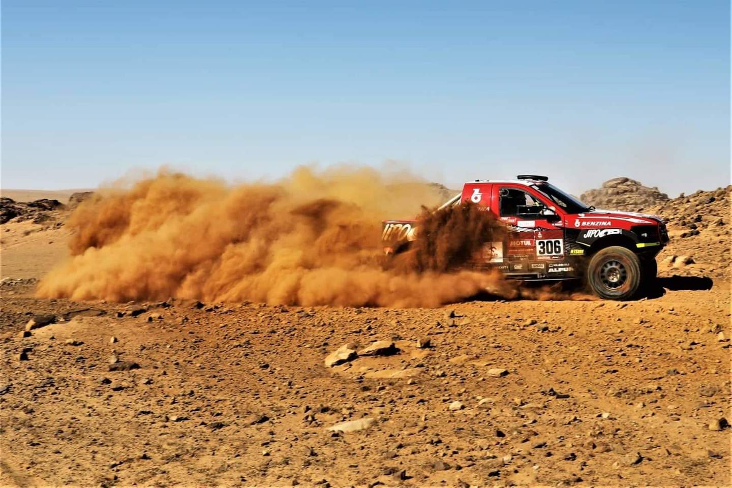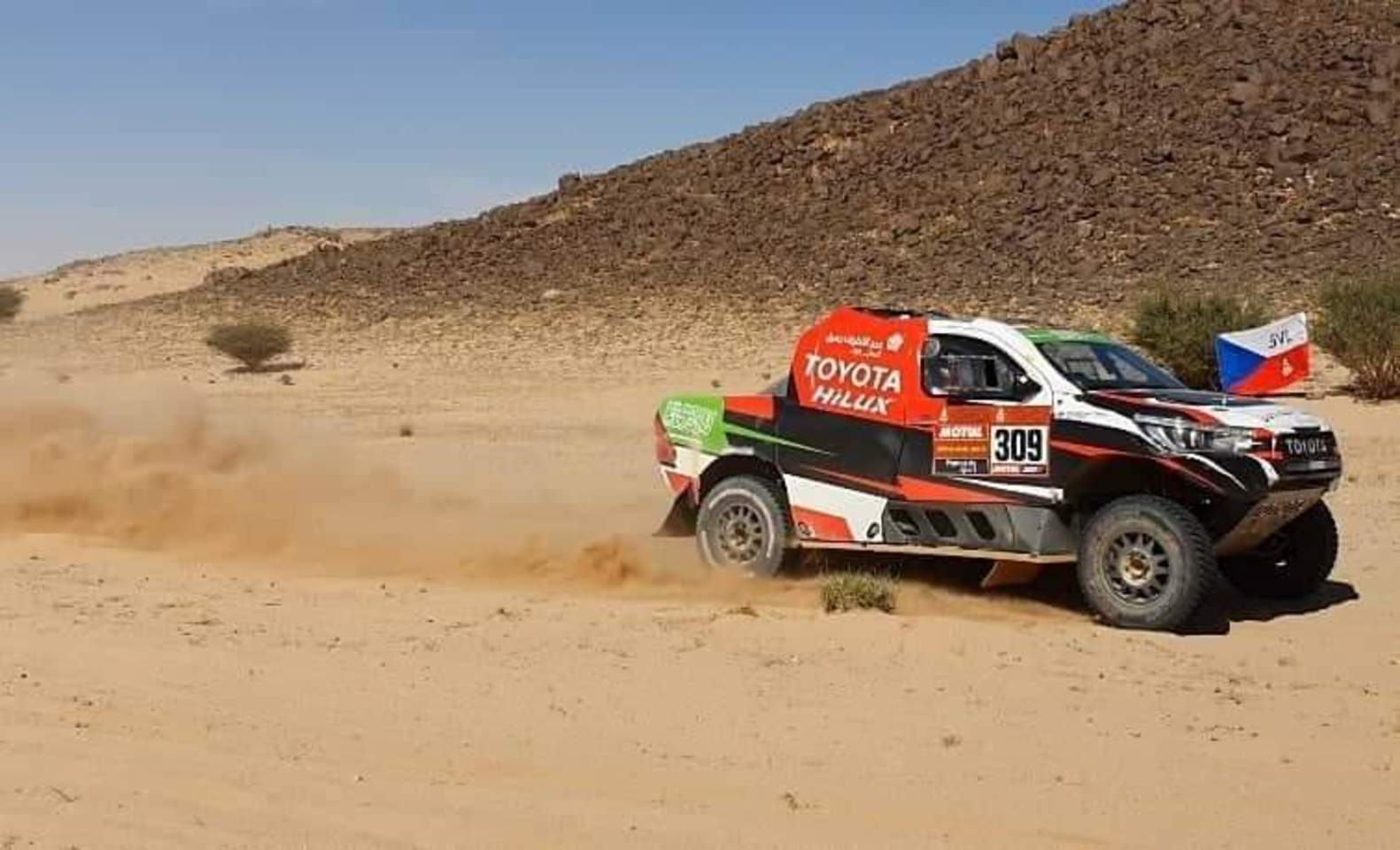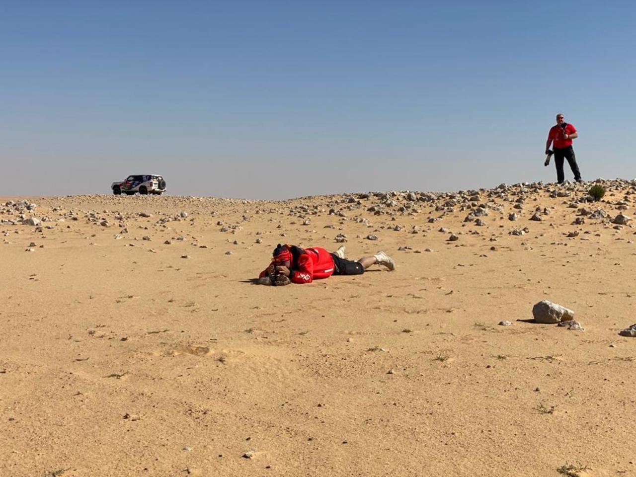 Etapa se vyznačovala velkými šutráky, prachem a taky pískem ( i my jednou vykopávali auto). Závodníci v první etapě malinko bloudili a bylo dost defektů, vlastně na takto ryché etapě defekty rozdávali umístnění a pořadí po prvním dnu. Bylo hodně teplo a největší asi Romainu Dumasovi (vítězi Pikes Peaku a závodu LeMans ), kterému bohužel shořelo auto. Jako příznivec motorů a obsahů, nesnášející turba a již vůbec né elektro kokšoviny, jsem přemýšlel, zda ho ten nahoře v Saudské, kde nafta stojí na naše cca 3,20, nepotrestal za rouhání a koketování s elektro auty.