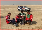 Co mi absolutně hlava nebere, jsou jezdci v kategorii malé moto. Jezdci jsou tu sami sobě servisem i mechanikem. O svou závodničku se starají sami, musí jim stačit jen bedna s nářadím, kterou jim vždy po etapě pořadatel přiveze do bivaku. Při závodě si tak musí dávat veliký pozor a zdaleka nemůžou tolik riskovat. "Snažím se hlavně nepadat. Ve třetí etapě jsem uhýbal autu a šel jsem přes řídítka. Musel jsem udělat servis řídítek a šel spát až o půlnoci. Ale teď to funguje ještě lépe než předtím," pochvaluje si Krejčí. I přez to bojují o bednu. Tedy až právě na Romana Krejčího, který měl v 6 etapě pád zhruba na 350. kilometru a vykloubil si rameno. Krejčí se po pěti etapách držel na 43. místě a bojoval o medailové umístění v dílčí kategorii jezdců soutěžících bez asistence. Jsou to borci. Dovedu si to jakž takž představit na závodech u nás, ale tady…. Klobouček dolů. Největší problémy v 6 etapě měl Tomáš Ouředníček s Davidem Křípalem, do kterého 3 km před cílem v plné rychlosti nešťastně napálil kamion Nizozemce Martina van den Brika a zničil mu celý předek. Auto se mu podařilo dotáhnout do cíle se ztrátou více jak 3 hodin. Prasklá vana na motoru, prasklé držáky motoru, rám dostal opravdu velkou ránu. Chlapy ale nic nevzdávají a rozhodli se pokračovat. Pomáhali mu k tomu i mechanici právě od van den Brika, který se mu přišel i omluvit.