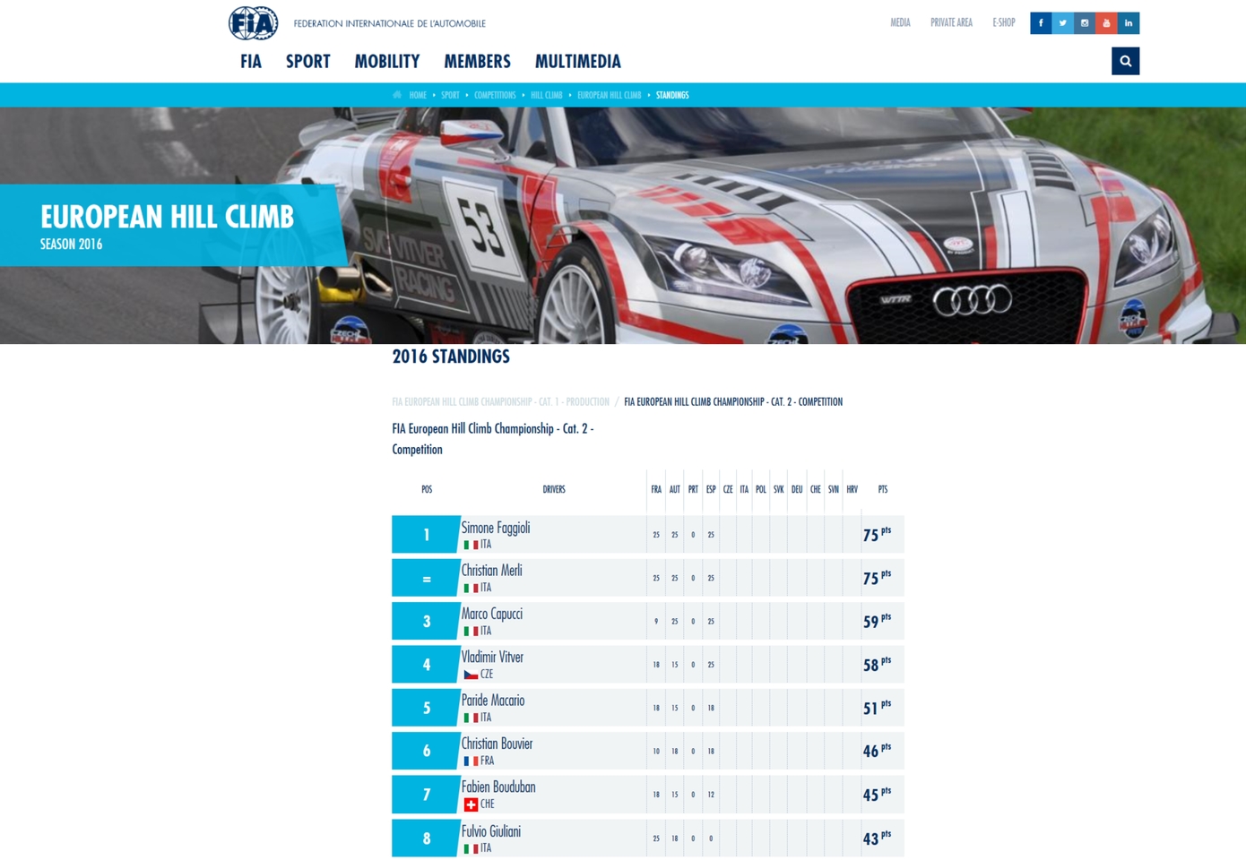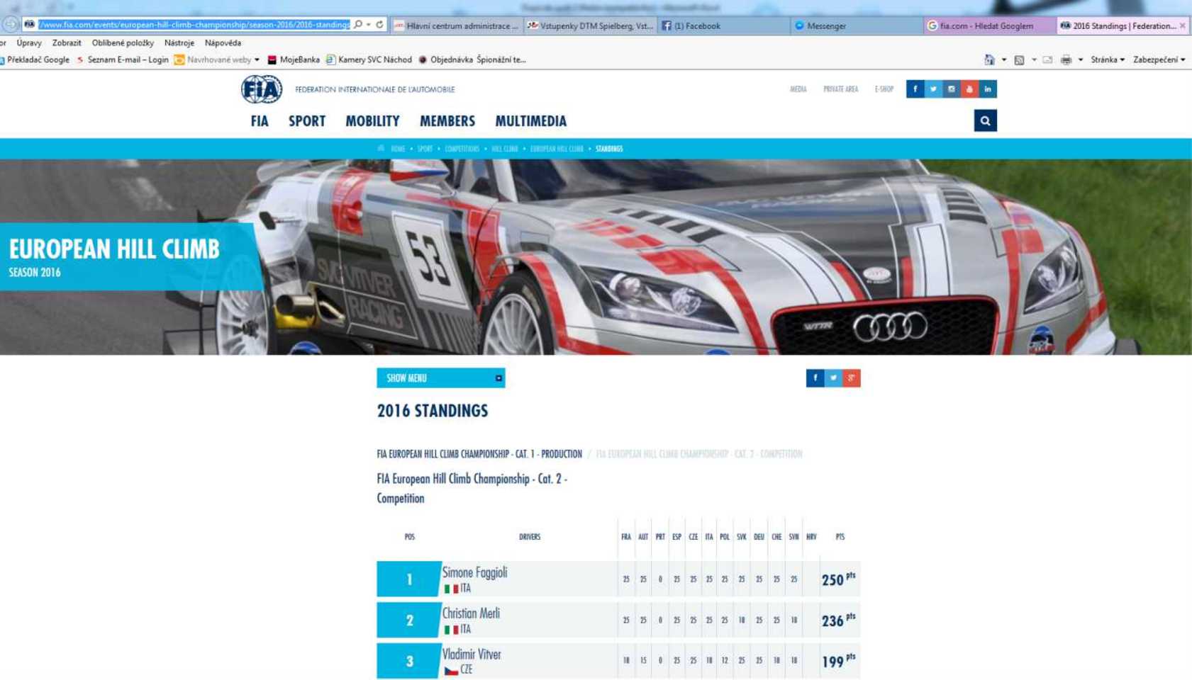 2015 European Hill-Climb Championship - Cat.2 po Glasbachu Pos Drivers Pts 1. Simone Faggioli (ITA) 2. Miloš Beneš (CZE) 3./4. Vladimir Vitver (CZE) / Fausto Bormolini (ITA) 5. David Hauser (LUX)............... 8. Martin Šípek (CZE)