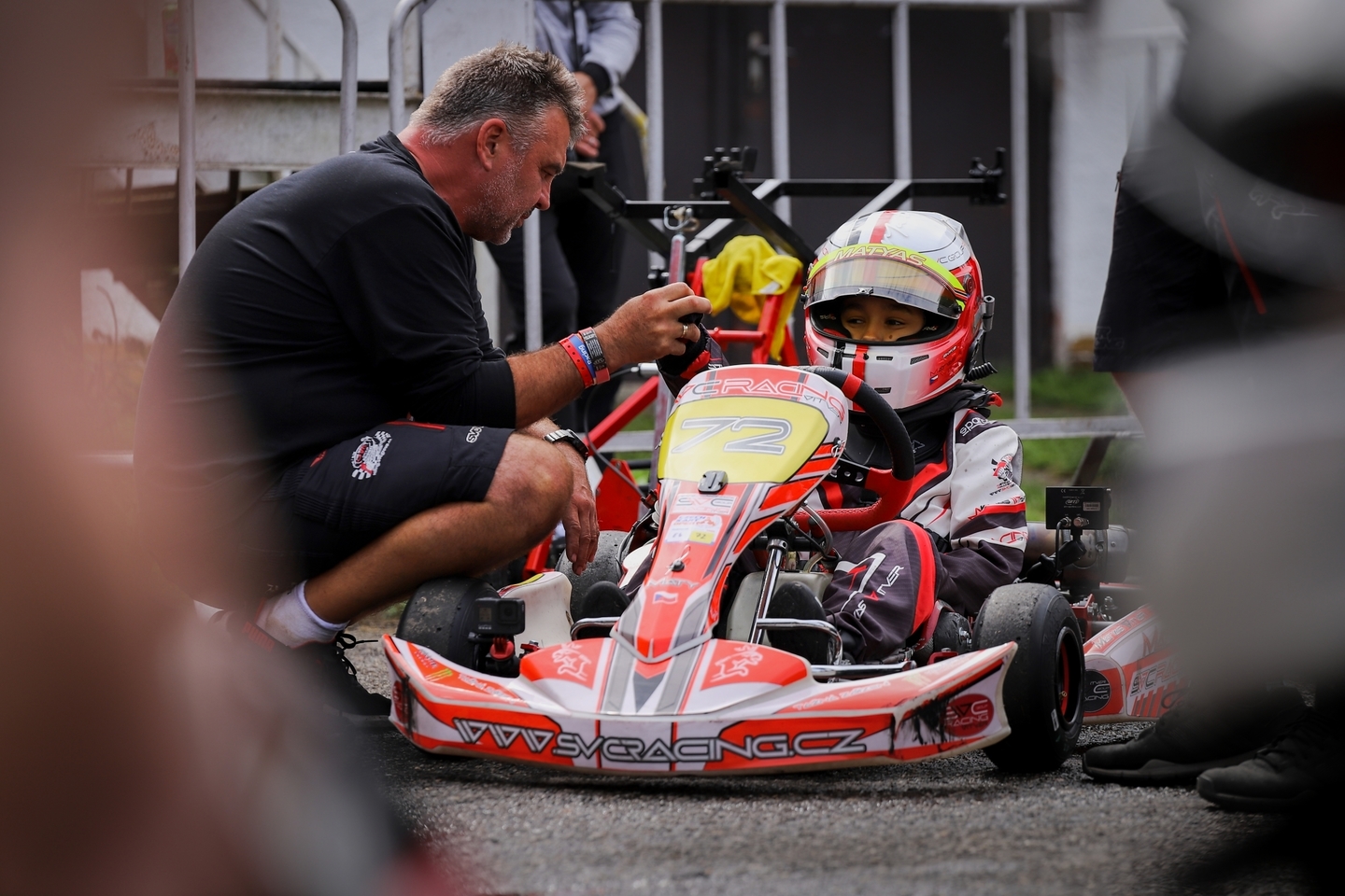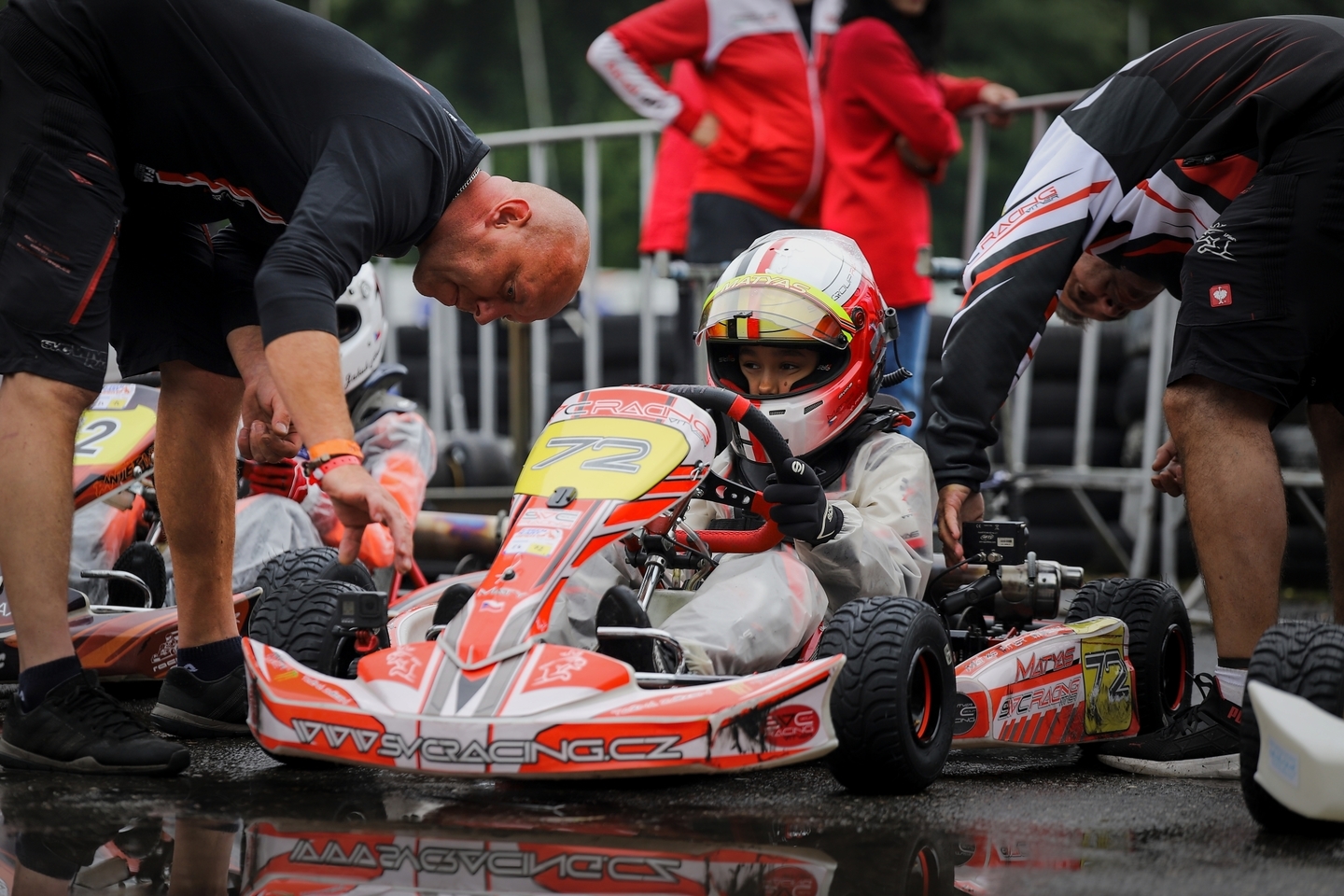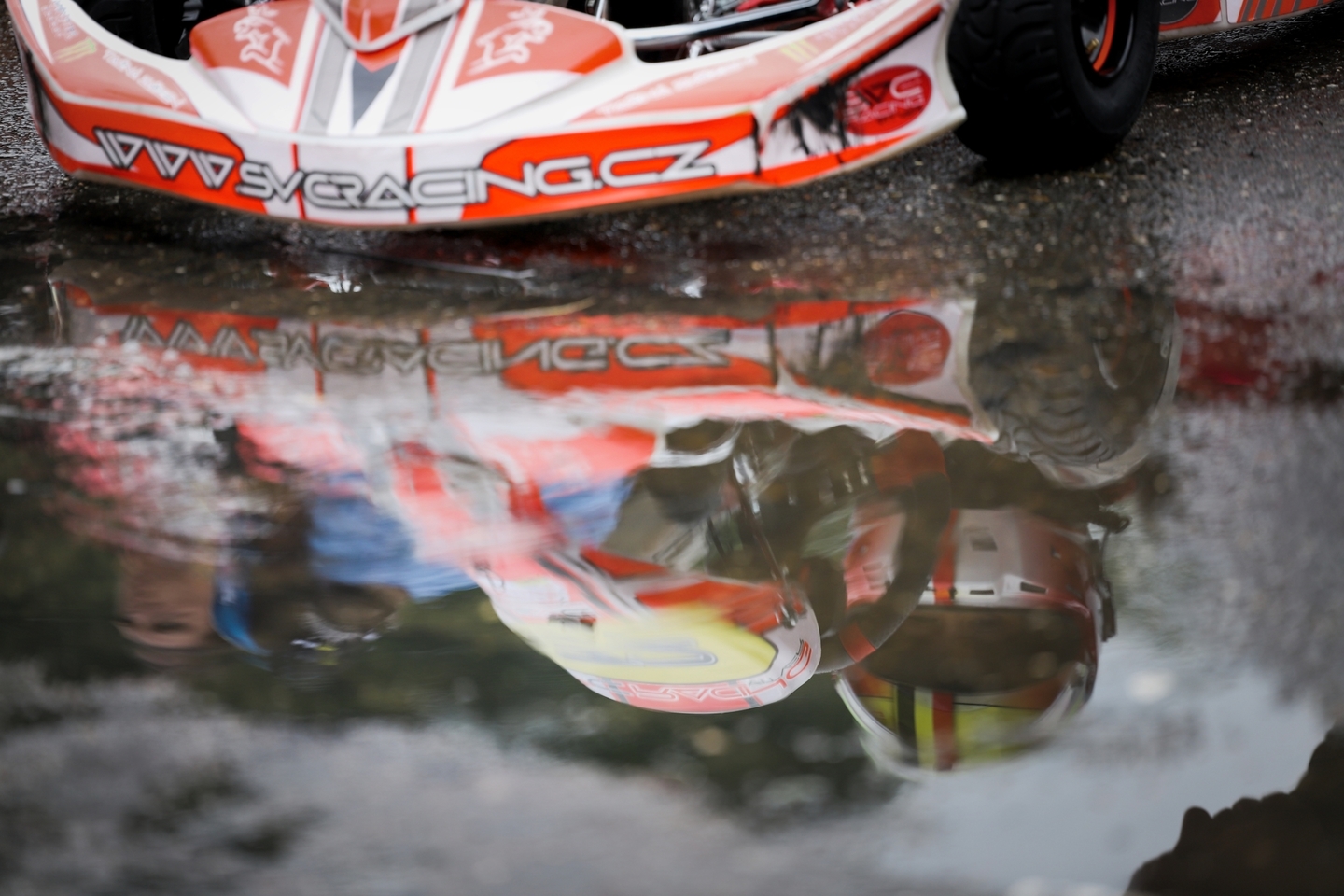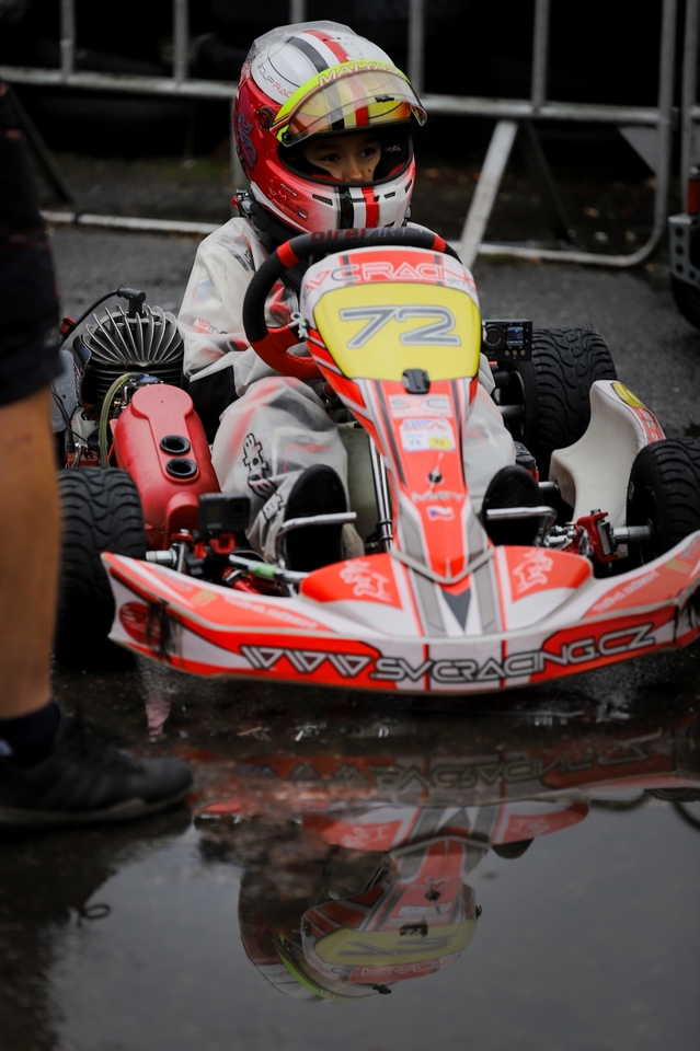 - Nedělní ranní trénink byl pro naši třídu již tak trošku v závodním režimu…minimálně v tom, kdo rychleji přezuje na mokré …káry byly již s piloty připravené na start, když přišla obrovská průtrž a všichni mechanici začali kmitat…piloti z kár, káry na vozíky a rychle poklusem do stanu pro mokré pneu a ještě rychleji zpět, ať se stihne zajet alespoň nějaké kolo. My jich stihli pouze 5, ale se svým nej časem 57.554 na kolo nám Maty opět dokázal, že má vodu rád a hlavně, že ji suprově dává.