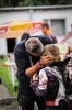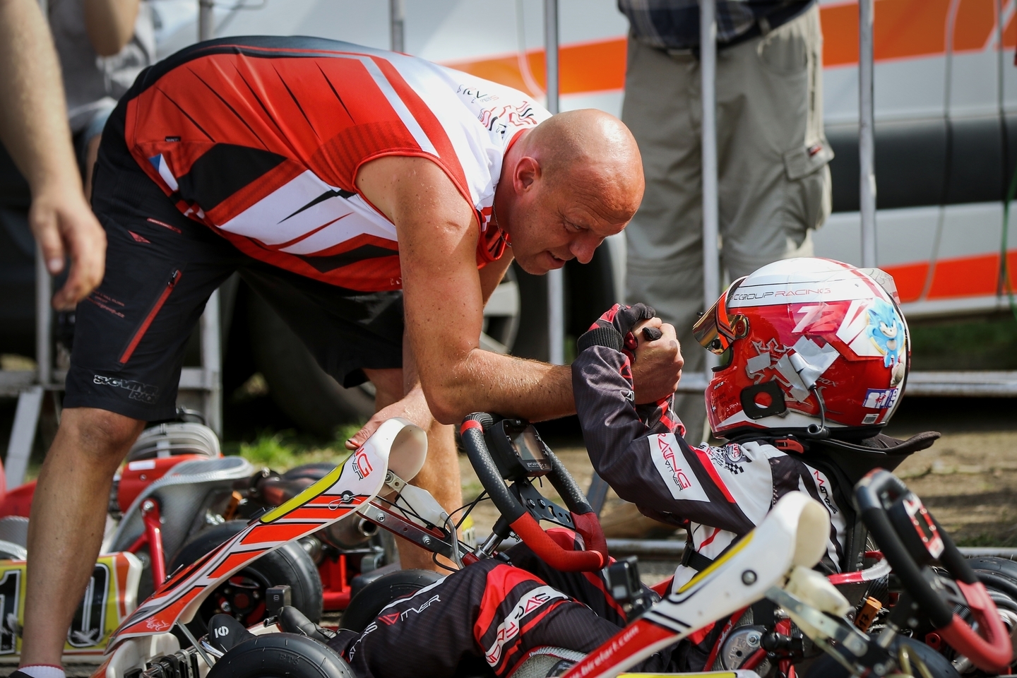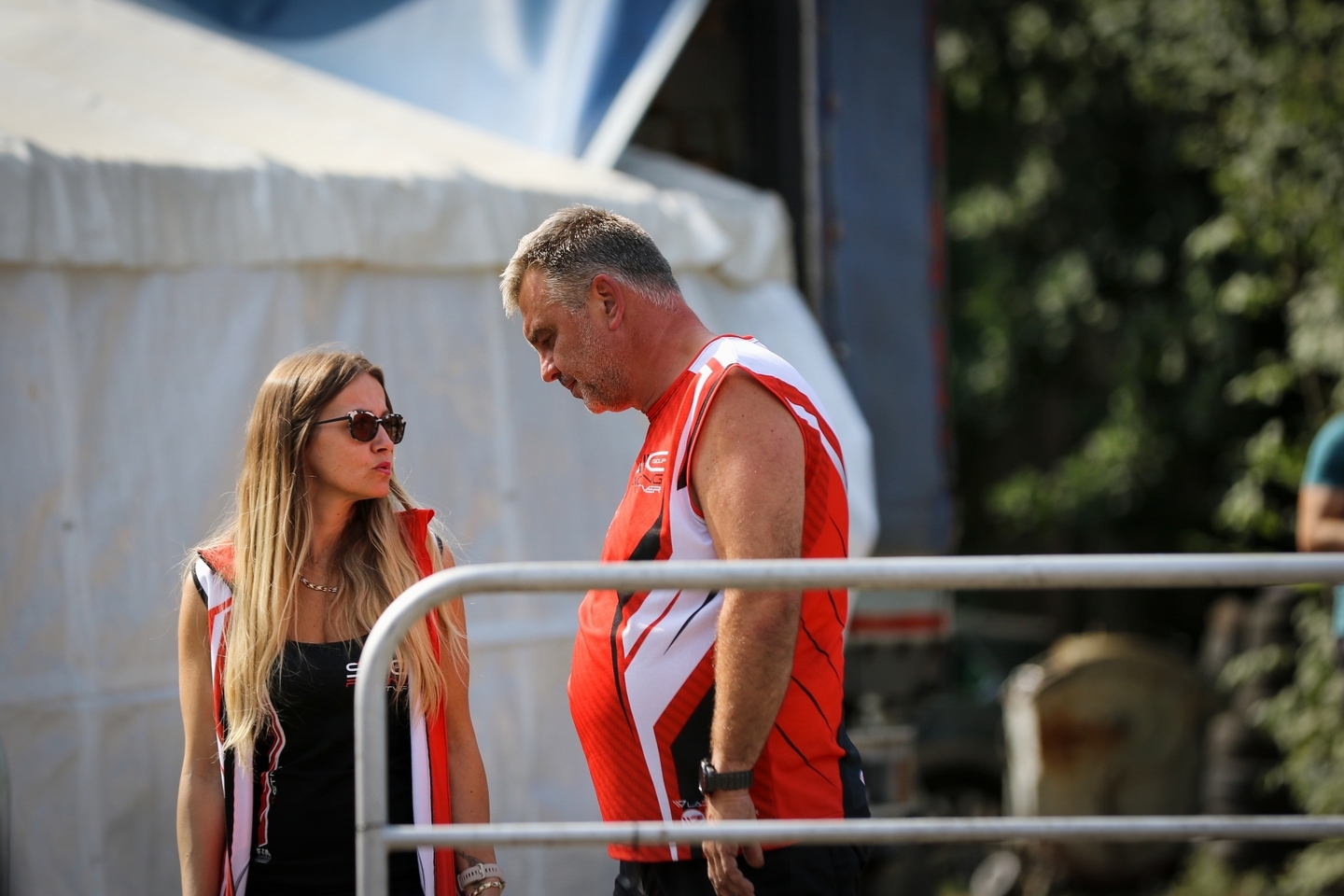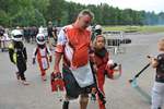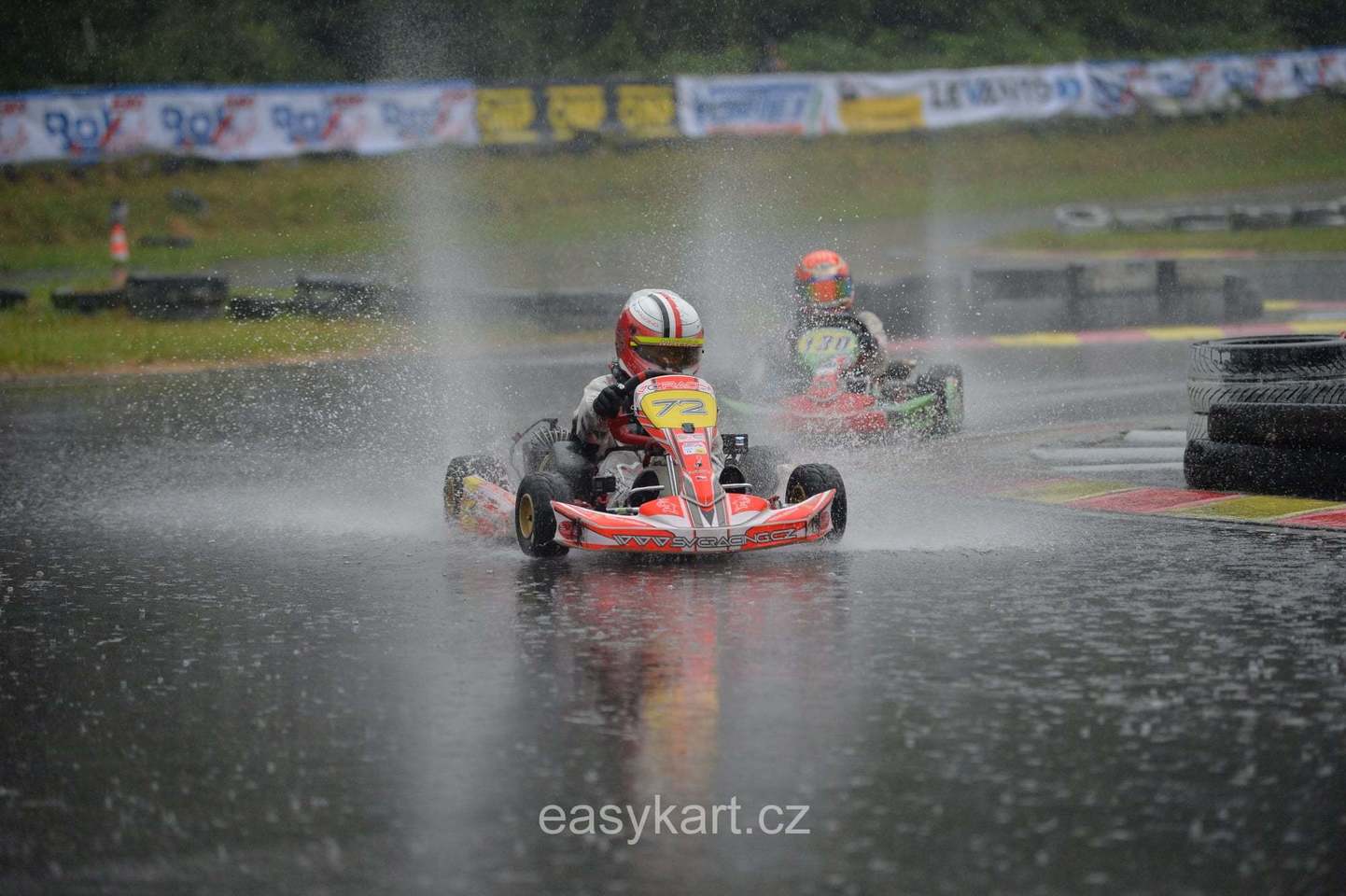 - Nedělní ranní trénink byl pro naši třídu již tak trošku v závodním režimu…minimálně v tom, kdo rychleji přezuje na mokré …káry byly již s piloty připravené na start, když přišla obrovská průtrž a všichni mechanici začali kmitat…piloti z kár, káry na vozíky a rychle poklusem do stanu pro mokré pneu a ještě rychleji zpět, ať se stihne zajet alespoň nějaké kolo. My jich stihli pouze 5, ale se svým nej časem 57.554 na kolo nám Maty opět dokázal, že má vodu rád a hlavně, že ji suprově dává.
