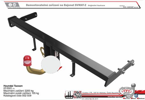 Výrobek je vyráběný dle požadavku vozu a Homologovaný pro prodej a provoz ve všech státech EU dle příslušných norem EHK-55R, podle zastaralé normy e94/20 zrušené již v roce 2016, která nesplňuje, dlouhodobě podmínky pro provoz nevyrábíme. Chráněný vzor SVC - bajonet SVMAT-2 je možné zaměnit za dvou šroubové provedení SVC, bez výměny tažného zařízení.