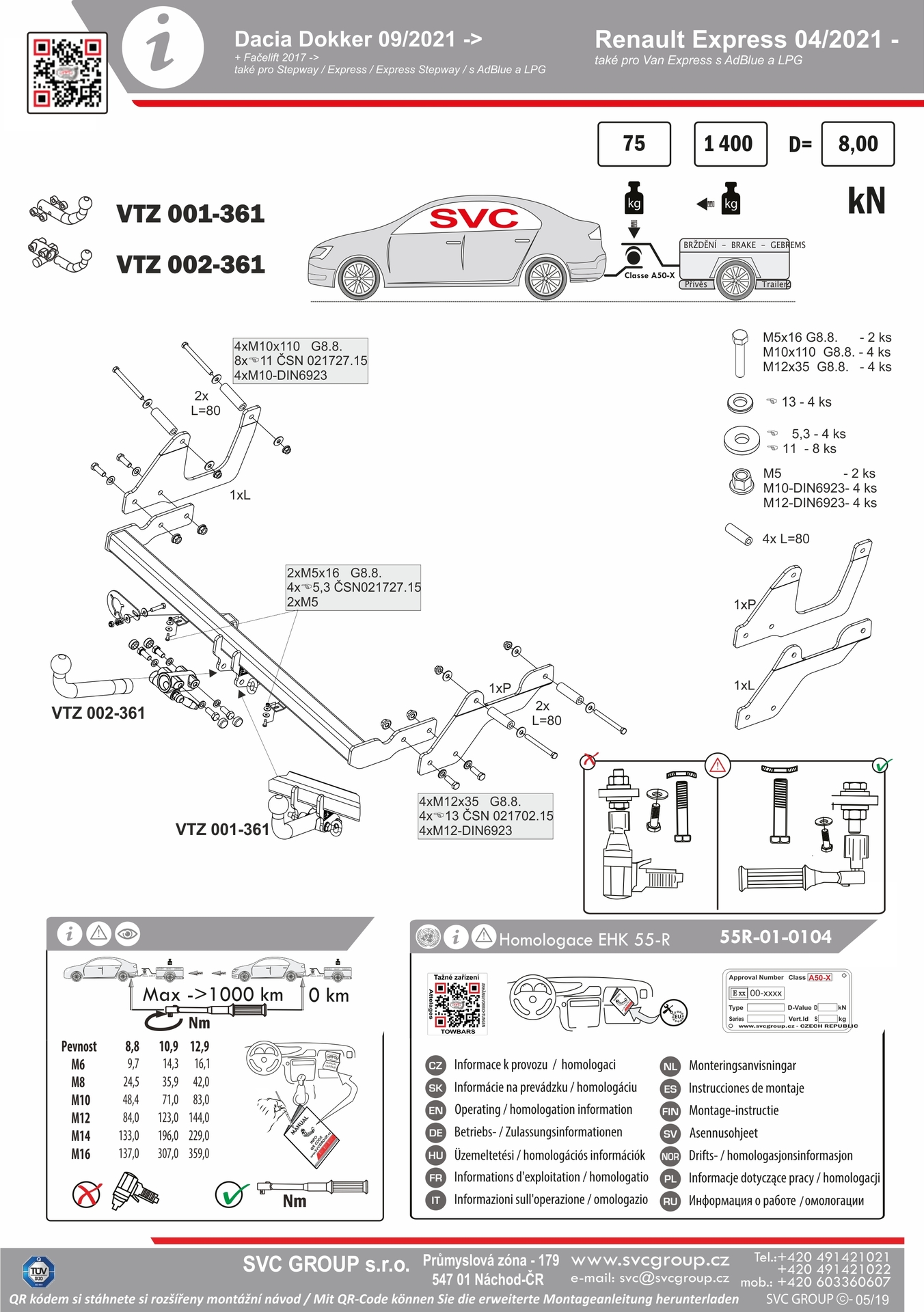 Tažné demontovatelné tažné zařízení Renault Expres 2021+ včetně: Express VAN + 7 místné verze a LPG - Při požadavku tažného pro nosiče kol doporučujeme typ tažného VTZ 001-361 - Zesílená konstrukce tažného Originální od ČESKÝ VÝROBCE