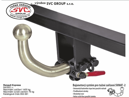 Výrobek je vyráběný dle požadavku vozu a Homologovaný pro prodej a provoz ve všech státech EU dle příslušných norem EHK-55R, podle zastaralé normy e94/20 zrušené již v roce 2016, která nesplňuje, dlouhodobě podmínky pro provoz nevyrábíme. Chráněný vzor SVC - bajonet SVMAT-2 je možné zaměnit za dvou šroubové provedení SVC, bez výměny tažného zařízení.