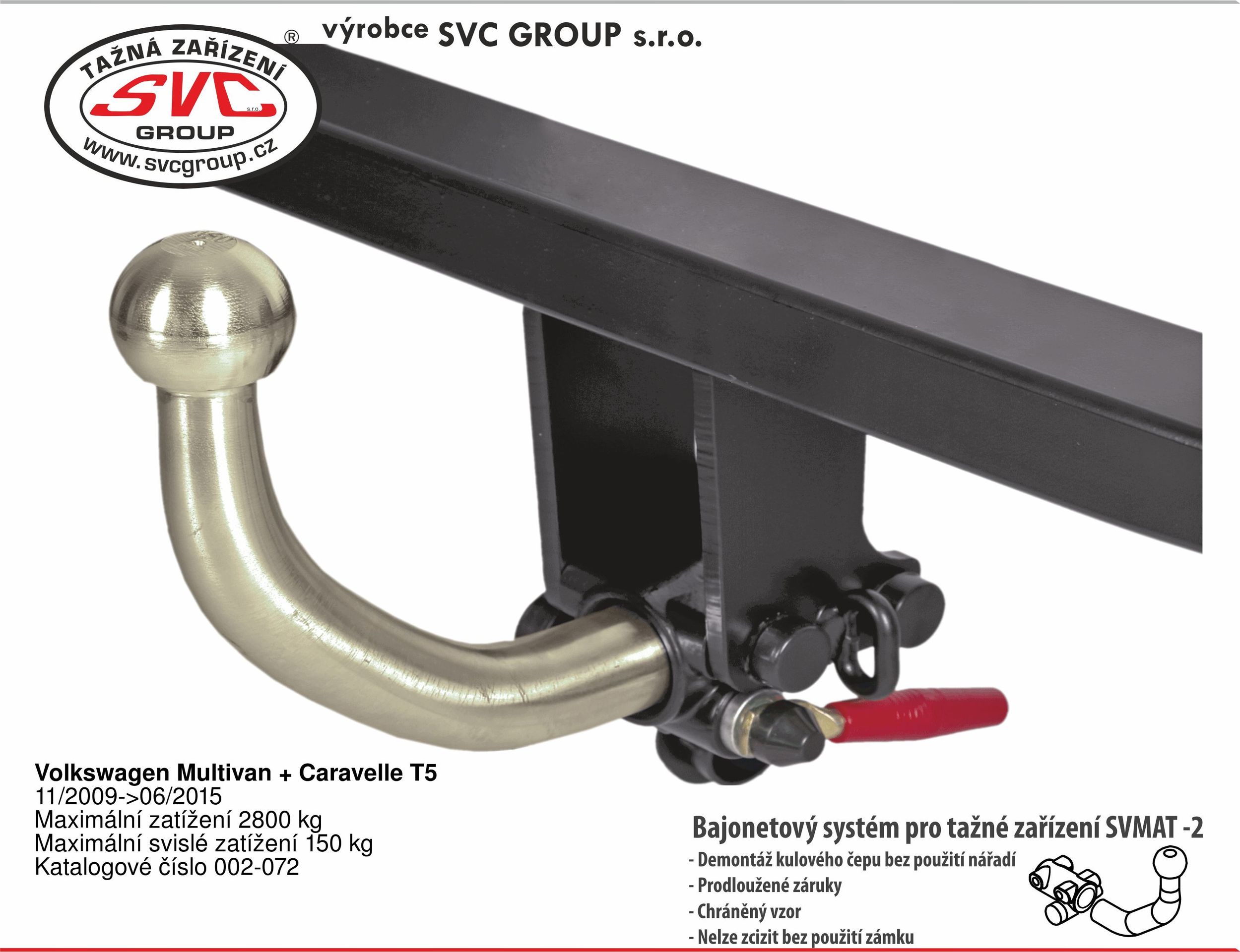 Výrobek je vyráběný dle požadavku vozu a Homologovaný pro prodej a provoz ve všech státech EU dle příslušných norem EHK-55R, podle zastaralé normy e94/20 zrušené již v roce 2016, která nesplňuje, dlouhodobě podmínky pro provoz nevyrábíme. Chráněný vzor SVC - bajonet SVMAT-2 je možné zaměnit za dvou šroubové provedení SVC, bez výměny tažného zařízení.