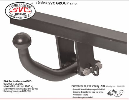 Dvou šroubové provedení SVC, nejpoužívanější a cenově nejdostupnější upevnění kulového čepu k zařízení, tak zvané upevnění kulového čepu na dva šrouby také nazývané napevno. Povrchová úprava je provedena metodou KTL v matném černém odstínu, které s četnými spodními hranami nárazníku nebudou rušit estetiku vašeho vozu po montáži tažného zařízení. Kulový čep se na základě nařízení EU nemusí demontovat z vozu, můžete jej mít celoročně namontovaný na voze, pokud nezakrývá registrační značku nebo činnou plochu osvětlení vozu, bez připojeného vozíku. Systém je průmyslově chráněný vzor a je záměnný z bajonetovým systémem SVMAT-2. Na základě norem ČSN je pohlíženo na šroubové provedení jako na rozebíratelný spoj za použití nářadí.