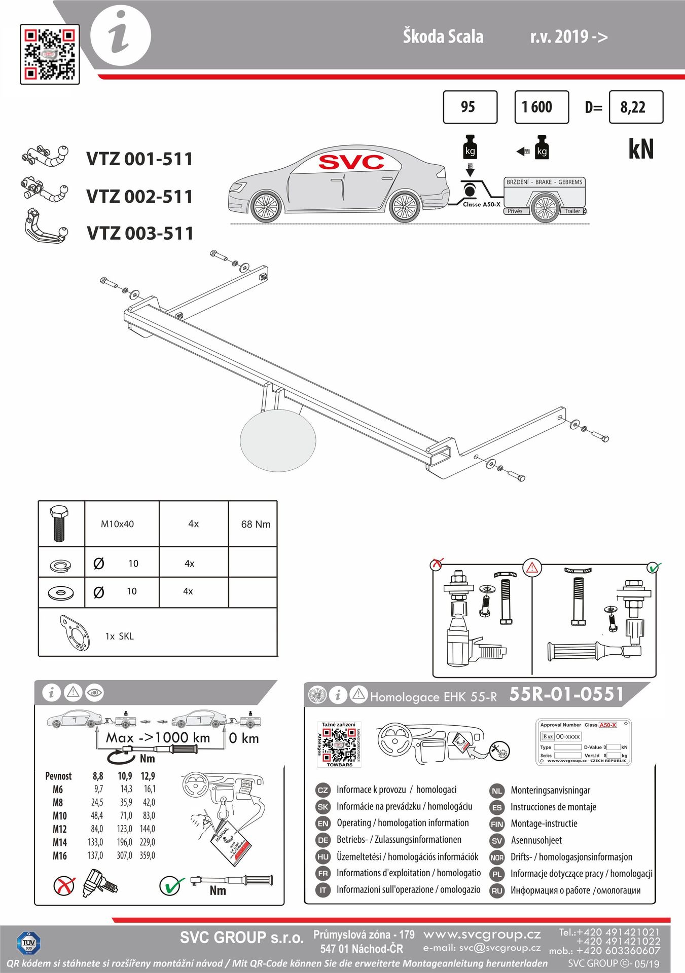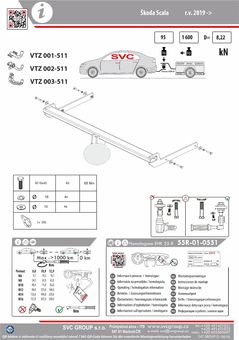 Demontovatelné tažné zařízení SVC Škoda SCALA od roku výroby 2019 také pro iV , iVRS, 4x4 a diesel s AdeBlue , také pro facelift v roce 2021. U vozidel Škoda Scala je důležité dodívat se do technického průkazu zda je pro váš typ možné vybavit vozidlo tažným zařízením. Tuto informaci by vám měl sdělit slušný prodejce vozu nebo tato informace je ve velkém technickém průkazu vozidla řádek 17, a 01. Povoleno není, pokud v této kolonce není vyplněný zatěžovací údaj, nebo tam jsou vyplněné jen nuly, pak výrobce vozu neumožňuje montáž tažného zařízení.