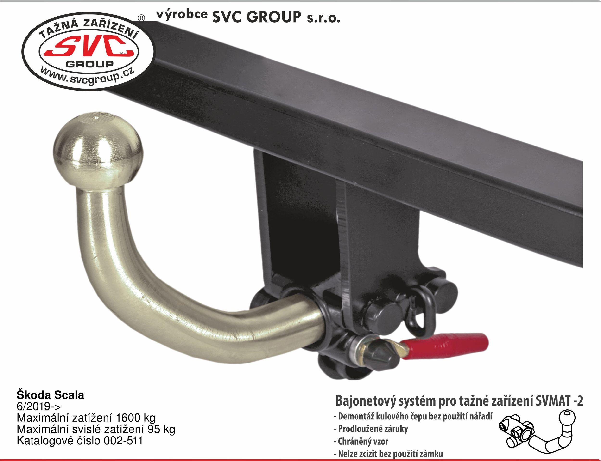 Výrobek je vyráběný dle požadavku vozu a Homologovaný pro prodej a provoz ve všech státech EU dle příslušných norem EHK-55R, podle zastaralé normy e94/20 zrušené již v roce 2016, která nesplňuje, dlouhodobě podmínky pro provoz nevyrábíme. Chráněný vzor SVC - bajonet SVMAT-2 je možné zaměnit za dvou šroubové provedení SVC, bez výměny tažného zařízení.