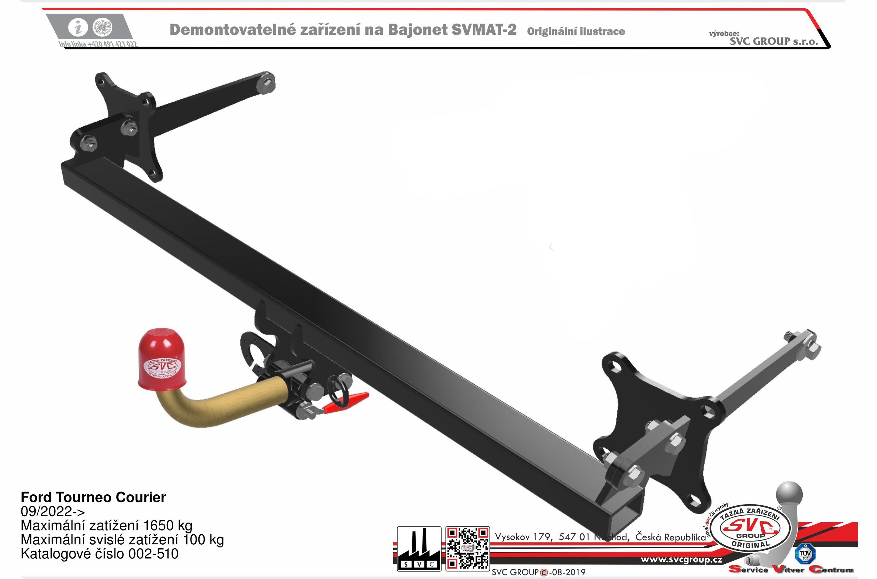 Výrobek je vyráběný dle požadavku vozu a Homologovaný pro prodej a provoz ve všech státech EU dle příslušných norem EHK-55R, podle zastaralé normy e94/20 zrušené již v roce 2016, která nesplňuje, dlouhodobě podmínky pro provoz nevyrábíme. Chráněný vzor SVC - bajonet SVMAT-2 je možné zaměnit za dvou šroubové provedení SVC, bez výměny tažného zařízení.