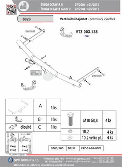 K tažné zařízení je dodáván zdarma montážního návod, typový list pro zapsání do technického průkazu a na webu výrobce jsou rozšířené montážní informace pro podporu montáže, která je jednoduchá a dle požadavku výrobce.