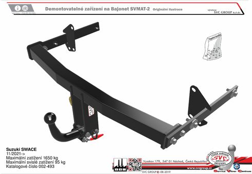 Výrobek je vyráběný dle požadavku vozu a Homologovaný pro prodej a provoz ve všech státech EU dle příslušných norem EHK-55R, podle zastaralé normy e94/20 zrušené již v roce 2016, která nesplňuje, dlouhodobě podmínky pro provoz nevyrábíme. Chráněný vzor SVC - bajonet SVMAT-2 je možné zaměnit za dvou šroubové provedení SVC, bez výměny tažného zařízení.