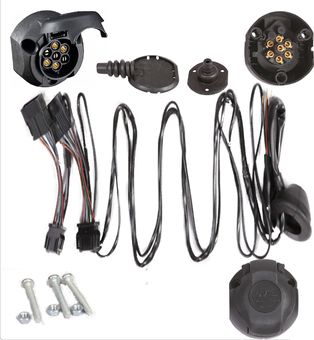 Set obsahuje: Auto zásuvku pro přesný typ tažného zařízení, gumičku pod zásuvku pro dlouhodobou životnost na vašem voze, gumové těsnění, průchodku na daný typ vozu, propojovací kolíčky, spojovací materiál a návod zapojení.